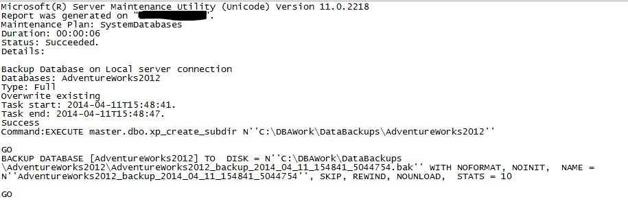 When you execute the plan, it will create a .TXT file in the folder you specified, with the name of the maintenance plan and subplan along with the date and time, as shown below. Here is the log for one of my plans.