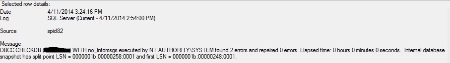 In this case, there is corruption in the database. The log file will show the details on of the corruption. I have an extract of the log file shown below.
