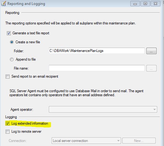 The Reporting and Logging window also has an option to Log Extended Information. In this case, I setup a maintenance plan that backs up a database. I can open the Reporting and Logging tab again and check that box (highlighted below).