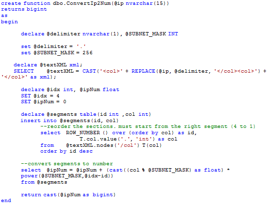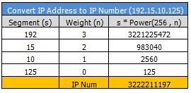 This function first splits the IP address into its four segments (delimited by a dot). This is where XML becomes really handy. We just create an XML string and use the parser to do the split for us by selecting the XML nodes. We use the Row_Number() function to create a factor which will help us arrive to the segment weight (i.e. segment: 192 has rownumber:1 and weigh: 4-1 = 3) . We now apply the conversion formula which consists of assigning a zero based weight to each segment (zero starting from the right segment) and multiplying this segment by (256 ^ n) OR POWER (256,n) where n = weight. The final step is to add all the segment results. For example, IP 192.15.10.125 is converted as follows: