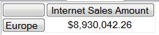 Now, let’s say we want to restrict Internet Sales Amount to where Sales Territory Group is Europe. As shown in listing9 below, MDX uses Dot Notations in the where clause as oppose to the equal to sign used in SQL.