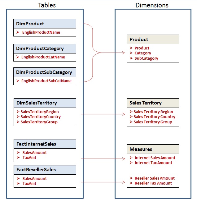 - All the “not so special” dimensions in the cube are referred to as “Regular” dimensions and are populated with textural data relating to the measures. In the relational database, the tables that hold the data that feed the Regular dimensions are called dimension tables and are normally identified with “Dim” either by schema or by naming conventions. For e.g. in figure1, all the tables mapped into the Regular dimensions in the cube have names prefixed with “Dim” (dbo.DimSalesTerritory dbo.DimProduct, dbo.DimProductCategory and dbo.DimProductSubCategory).