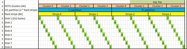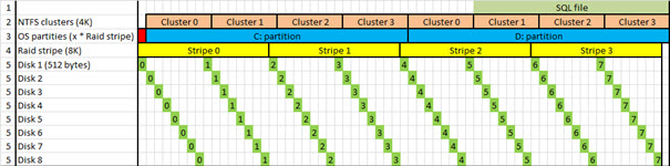 The red block pushes all top layers 512 bytes out of alignment with the raid and disk layers. If you now try to read Cluster 1 of the D: partition, you need to read stripe 2 AND stripe 3 of the raid stripeset, costing a 16KB read. Whilst the aligned only had to read 8KB.