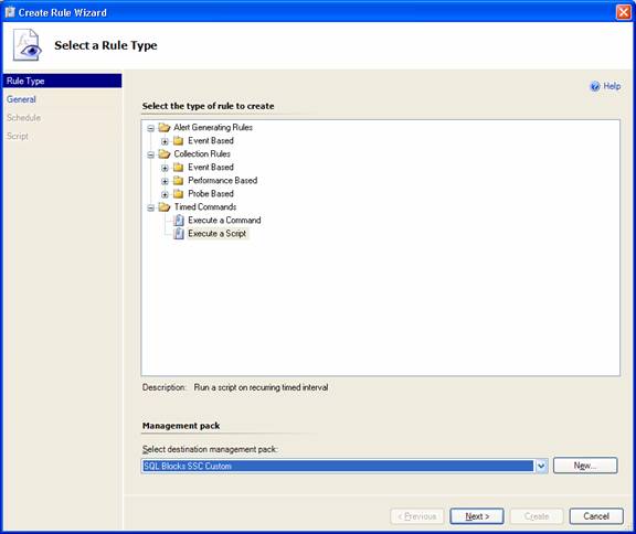 To create the 1st rule, in the Authoring pane of the SCOM console I right-clicked on the Rules node and selected Create a New Rule. Under Timed Commands, I picked the Execute a Script type and declared the destination management pack that I wanted the rule to reside in: