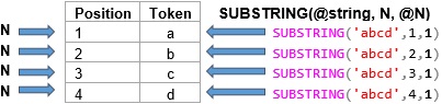 DECLARE @string varchar(100) = 'abcd', @N int = 1; -- @N = 1 for unigrams … SELECT Position = N, token = SUBSTRING(@string,N,@N) FROM iTally;