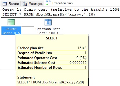 This also resolves the problem raised earlier with the ABS function causing a bogus value to be passed to our TOP clause. Logical Query Processing dictates that WHERE clauses are processed before TOP clauses and, unless @N is between 1 and the length of @string, the TOP clause is never evaluated. Check out the very inexpensive execution plan produced by this query: SELECT * FROM dbo.NGrams8k('xxxyyy',20);