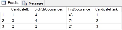 WHERE token = @SearchString;Using the same sample table, we’ll group by CandidateID. Now we can get the number of times @SearchString was found using COUNT(*) and the first occurrence of @SearchString using MIN(Position). For the candidate ranking we’ll use this expression: RANK() OVER (ORDER BY COUNT(*) DESC, MIN(Position)). Here’s the final solution: