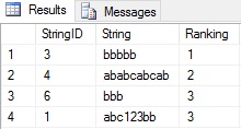 Notice that StringID 3 has the most b’s (five total) and is therefore ranked #1. StringID 4 has four b’s and is therefore ranked #2. Both StringID 6 & 1 have 3 b’s so their rankings are tied at #3.