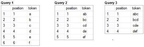 SELECT position, token FROM dbo.NGrams8K('abcdef',3); --Query 3 (trigrams)Figure 3: NGrams8K unigram, bigram and trigram results for “abcdef”