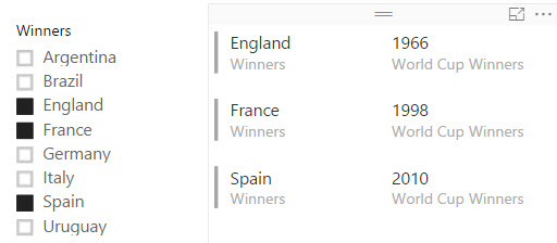 World Cup Wins (concat) = CONCATENATEX('World Cup Wins'; 'World Cup Wins'[Year]; ", ")Alternatively, if I want to see them in a specific order (in this case, descending by Year).