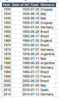 Later in the article I'm going to use another dataset, the winners of each edition of the FIFA Football World Cup. Although this is a tiny dataset, the data distribution allows me to demonstrate some of the issues that you are likely to run into when creating non-numeric measures.