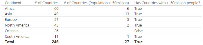 Alternate Syntax = COUNTROWS(FILTER('Area and Population Data';[Population]>50000000))Step 3: Evaluate whether or not the previous measure has a value of > 0 and return the boolean result.
