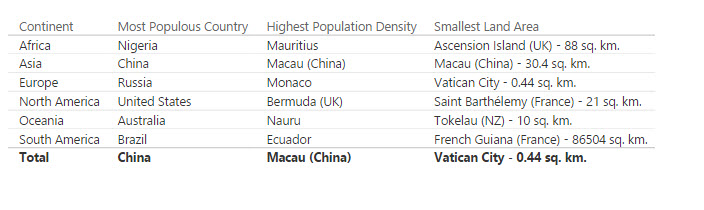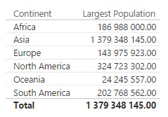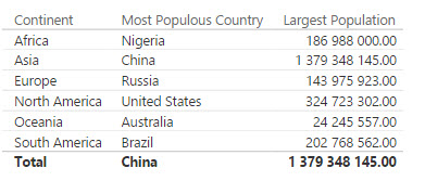 Notice that, as with all measures in DAX, the result is context specific. So in the total row, we see the single largest population across all countries in our dataset, but in the other rows it is the largest per continent.