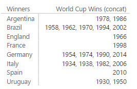 World Cup Wins (concat) = CONCATENATEX('World Cup Wins'; 'World Cup Wins'[Year]; ", "; 'World Cup Wins'[Year]; DESC)