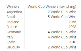 World Cup Winners (switching) = IF(COUNTROWS('World Cup Wins') = 1;VALUES('World Cup Wins'[Year]); FORMAT(COUNTROWS('World Cup Wins'); "0") & " World Cup Wins" )