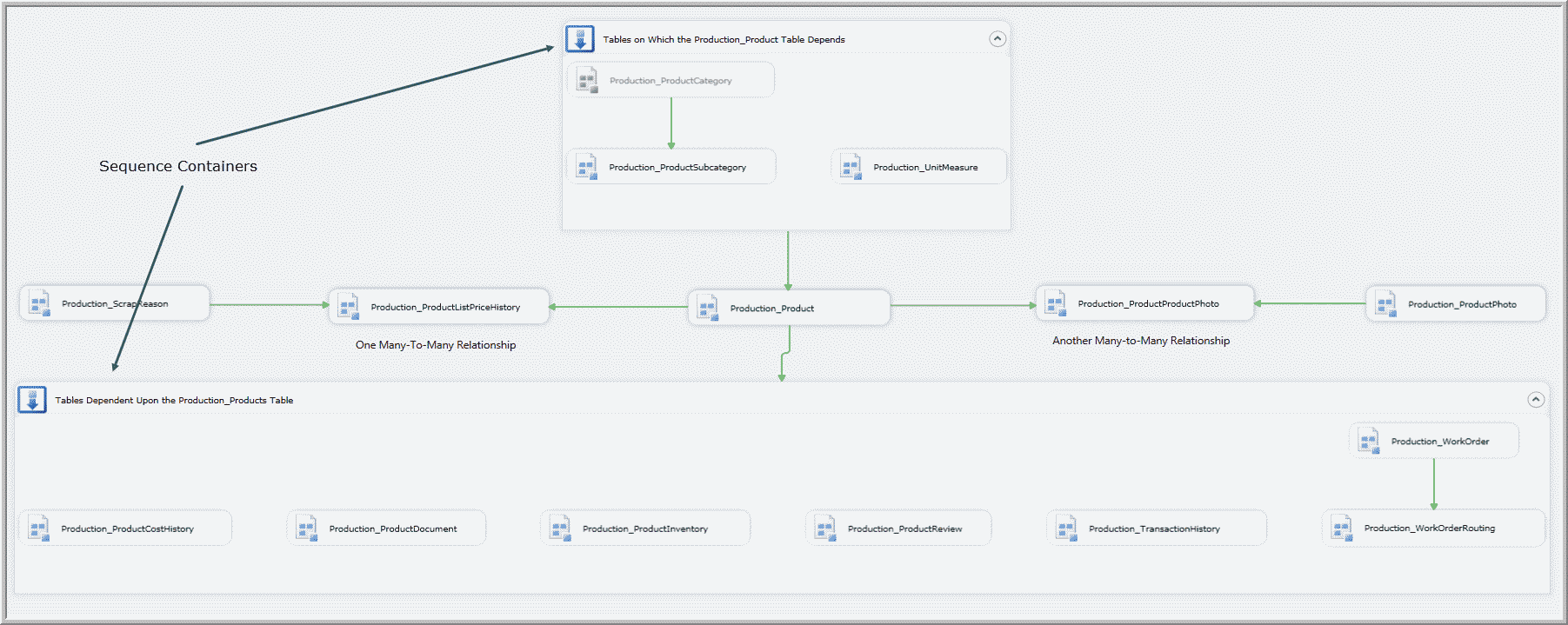 If the database uses schema objects to group tables and each schema contains a relatively few tables, it is likely that most of these tables within a schema will wind up in the same sequence container. At least one table in a sequence container (and sometimes only one table) will likely reference a table outside of its schema. In those cases, it usually works out that once a few significant and common tables in the load order are loaded, then precedence constraints can flow to the various sequence containers in parallel.