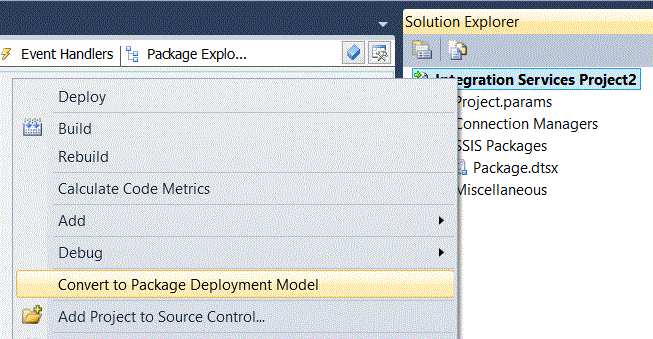 The figures used in this article to show how objects appear in SSMS and Business Intelligence Development Studio (“BIDS”) display the 2012 version of these tools. In the 2012 toolset, BIDS has been renamed SQL Server Data Tools (“SSDT”). For the purpose of using these images and viewing the images, the most significant differences between the 2012 versions of these tools and previous version are consequences of the new default deployment model in 2012 which permits deployment of projects rather than the deployment of packages. While it may have appeared that one was deploying a project with the Package Deployment Wizard, one was actually deploying multiple packages at the same time where the dependencies were implemented by extra code, property settings and configurations implemented by the developer. Previously, deployment had no concept of a project object. In the new 2012 model, deployment recognizes the project object, which can contain project-level variables (called "parameters") that are visible to each of the component packages without further work by the developer. The tree view in the project explorer of 2012 Data Tools has different nodes than the tree view of BIDS projects in previous versions. Despite these differences, the concepts discussed herein work in any version of these tools from SQL Server 2005 to the present. If you wish to make an SSIS project using SSDT 2012 appear precisely as it does in this article, then when you create a new project in 2012 you should immediately right click on the project name and select “Convert to Package Deployment Model“. See Figure 5. For more information about the 2012 deployment model, see Deployment of Projects and Packages. For more information about changes to SSIS implemented in SQL Server 2012, see What's New (Integration Services).