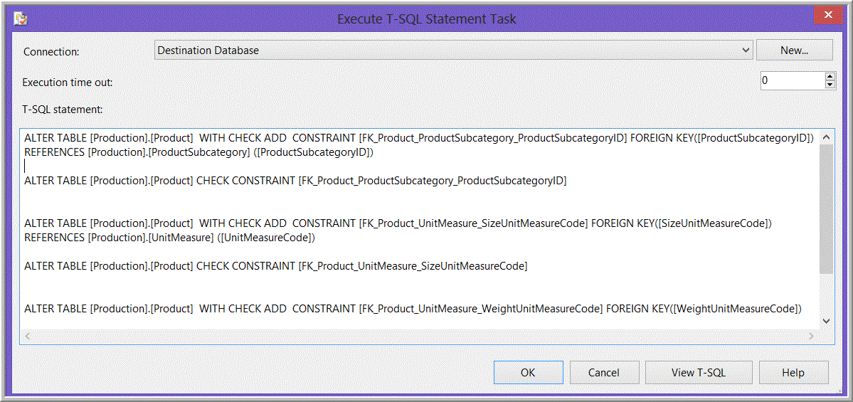 Figure 10. Example of code in an Execute T-SQL Statement Task recreating foreign key constraints.