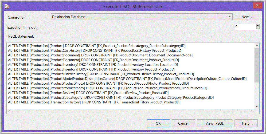 Figure 9. Example of code in an Execute T-SQL Statement Task dropping foreign key constraints.