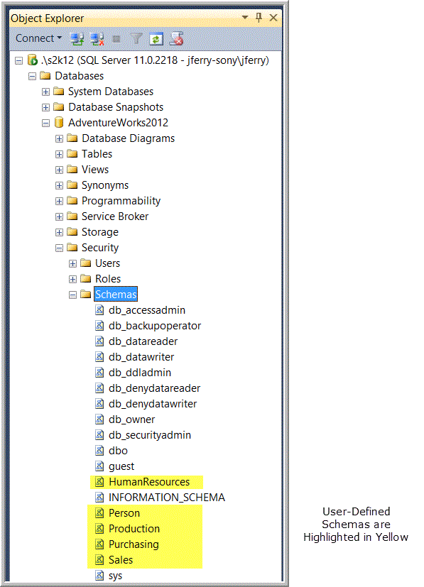 Figure 4 shows all the schema objects that belong in the AdventureWorks2012 database. The dbo, guest, and sys schema objects as well as the schema objects with names beginning with “db_” were created by the system and exist in every database before any user-defined objects are created within it. For further information on creating and using schemas in the AdventureWorks2012 database, see Schemas in AdventureWorks.
