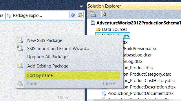 Figure 6. Context menu showing how to sort packages alphabetically in BIDS and SSDT.