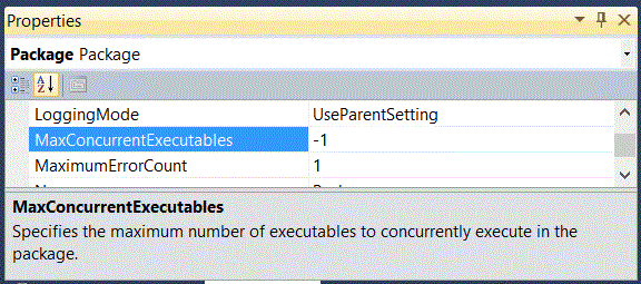 Figure 18. Properties window of a package showing the MaxConcurrentExecutables property.
