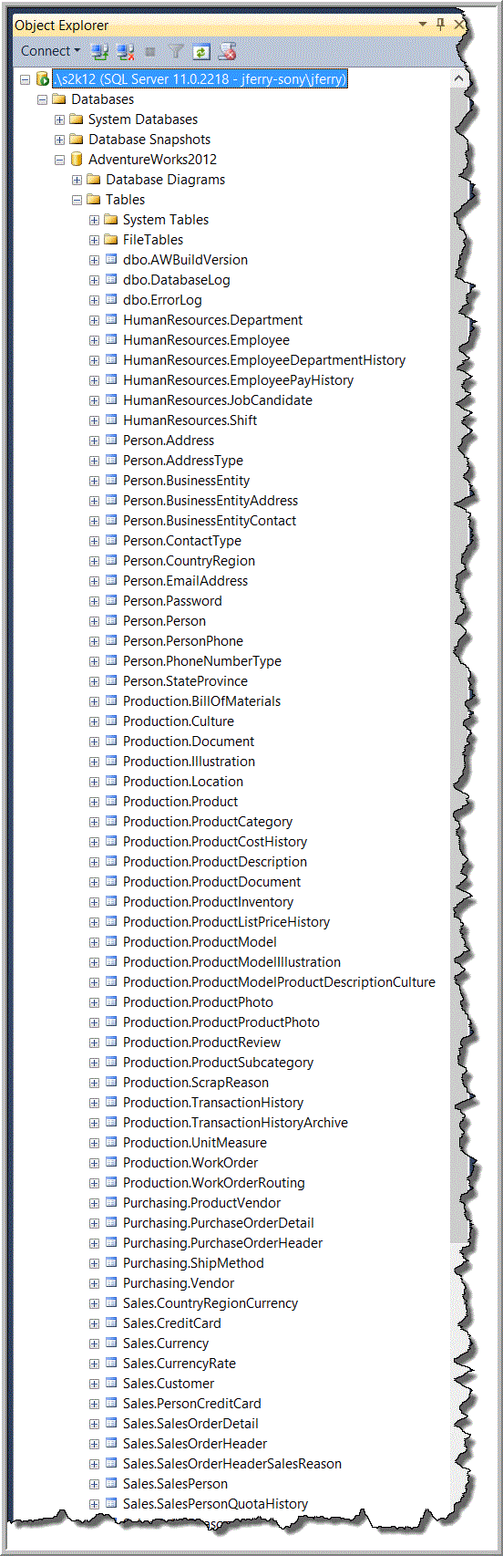 The AdventureWorks database will be the basis for demonstrations in this article and is available as a download from Adventure Works for SQL Server 2012. This sample database was designed to permit a demonstration of virtually every feature of SQL Server 2012 and therefore has more numerous and more complex relationships than I have encountered in actual production databases with which I have previously worked. For simplicity in demonstrating core concepts in this article, I will use only a few tables from the AdventureWorks2012 database. If all of the tables were included in my examples, the complex relationships would have so many consequences that it would be more difficult to see the points that I wish to make.