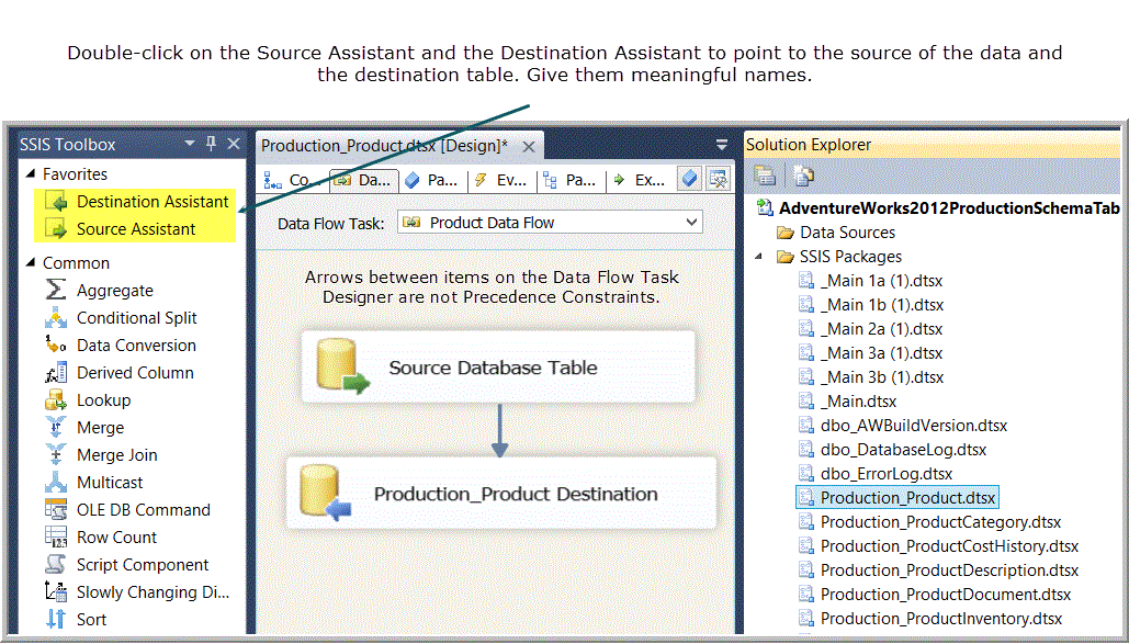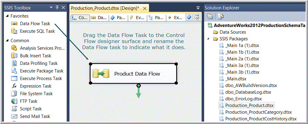 Because table names are unique across all schema objects in the AdventureWorks2012 database, I arbitrarily chose to omit a reference to schema names associated with tables when naming packages, tasks, data sources and destinations and transforms. It is important to label objects with descriptive names even if they will not appear in a log reflecting a successful execution. You will probably be logging the “OnError” event of every package, task and transform because the logging of the OnError event will contain helpful information in the “message” field. Quickly identifying the atomic component by which generated the error is facilitated by using unique descriptive names. See Implementing Logging in Packages for more information about logging events in SSIS packages.