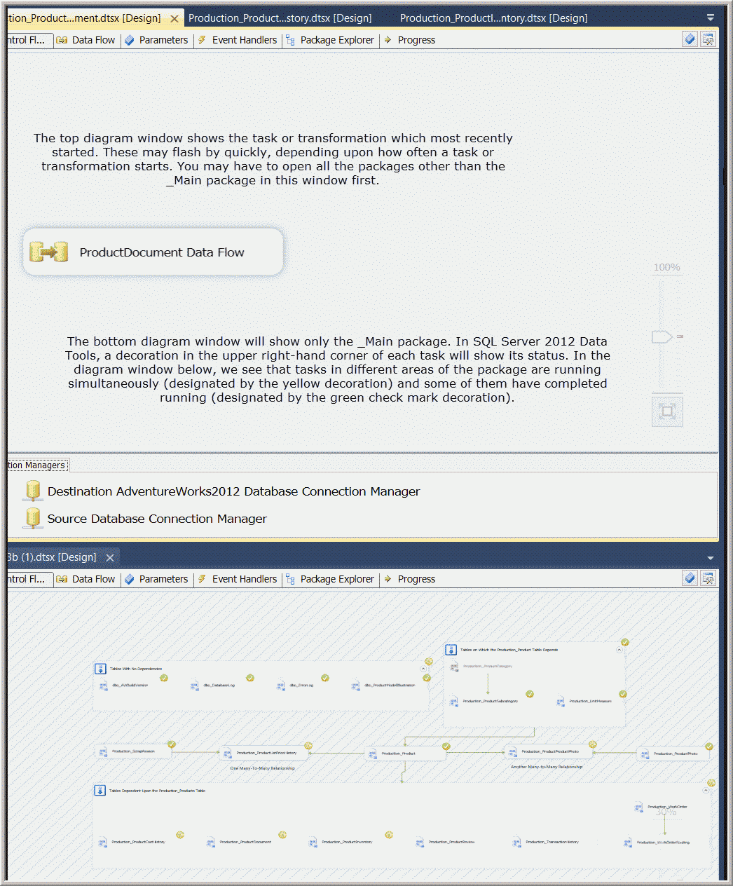 Figure 17. Image of SSDT during execution of a package using two diagram windows.