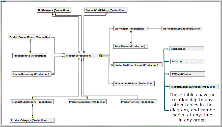 The relationships between tables in most databases are complex and are likely to be confusing. Determining the order in which to load tables while permitting enforcement and checking of referential integrity by the destination database is usually not trivial. A table may be dependent upon one or more other tables while, at the same time, there are one or more tables dependent upon it. These relationships constrain the order in which tables may be successfully loaded. Figure 1 demonstrates this complexity by showing that within the AdventureWorks2012 database, the Production.Product table is dependent upon four tables and has fourteen tables dependent upon it!