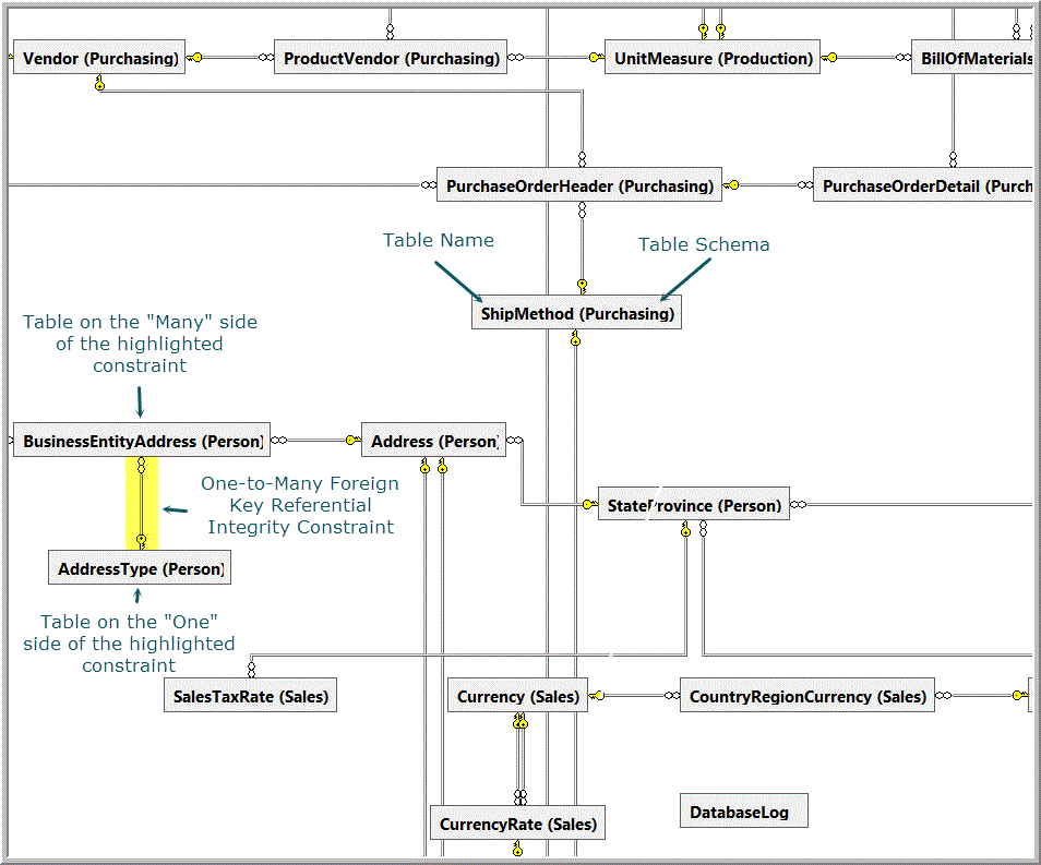This article may introduce a bit of confusion to some readers because the word “constraint” is associated with two concepts. First, we have referential integrity constraints, also called foreign key constraints. These types of constraints exist in a database. They are represented in database diagrams as lines going between one table and another table, or, less often, between a table and itself. They can be created graphically in SSMS, or with the T-SQL “ALTER TABLE” statement. If you are unclear about what referential integrity means or its importance to creating and maintaining a database, see Data Integrity