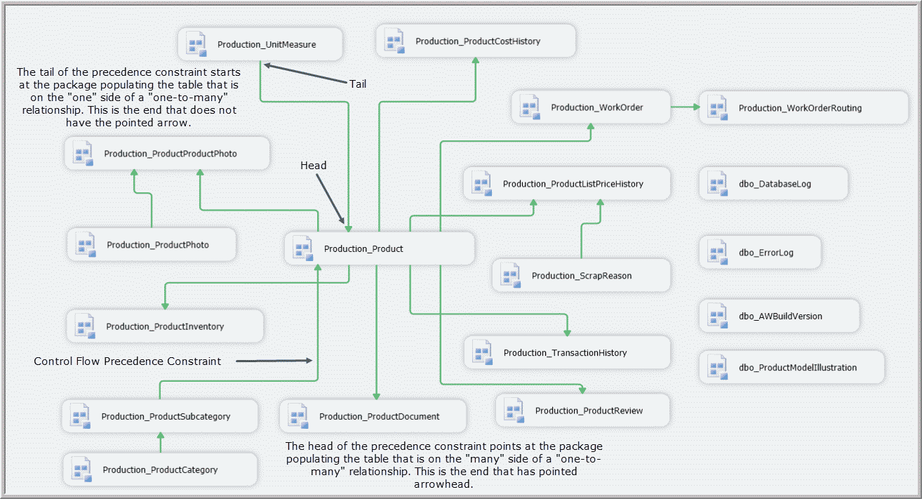 We can create a _Main package that follows the pattern of this database diagram and implements the precedence constraints that parallel the foreign key restraints the diagram displays. See Figure 15.