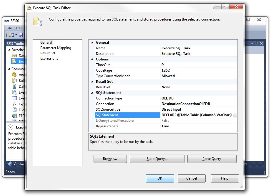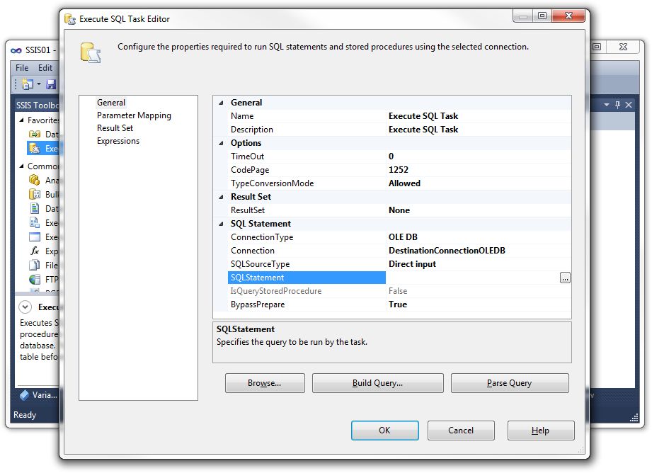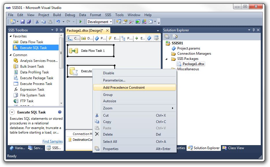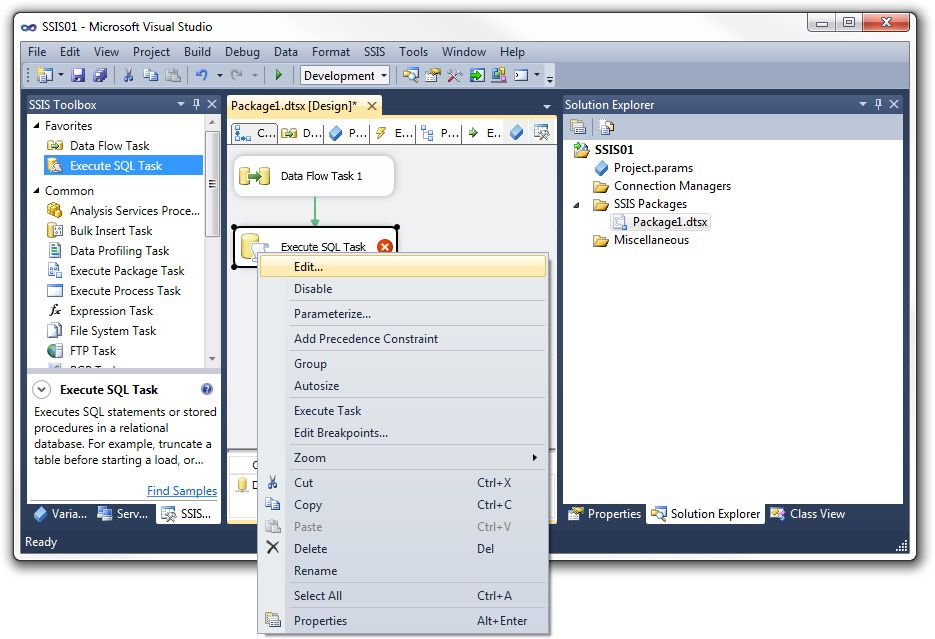 Right-click the Execute SQL Task component and select the Edit menu item.