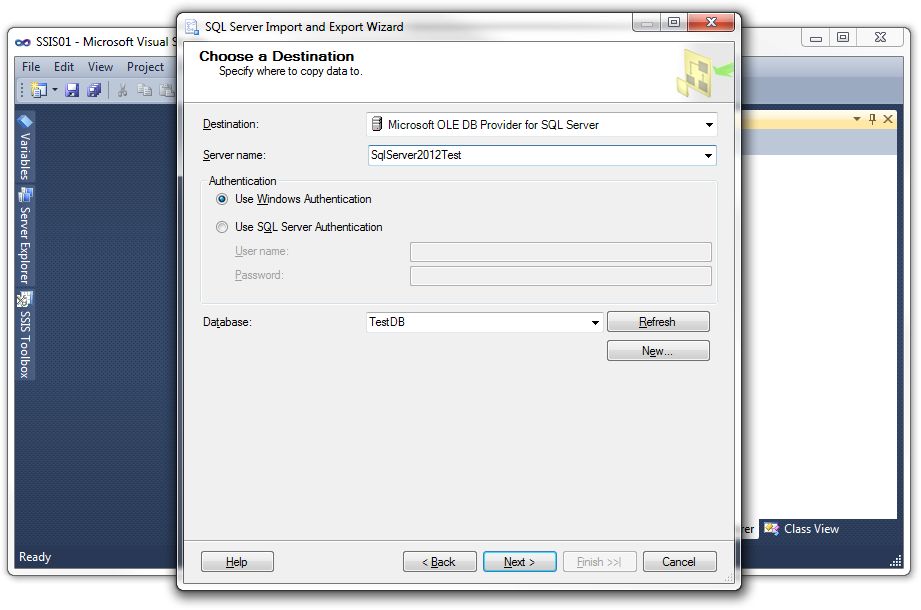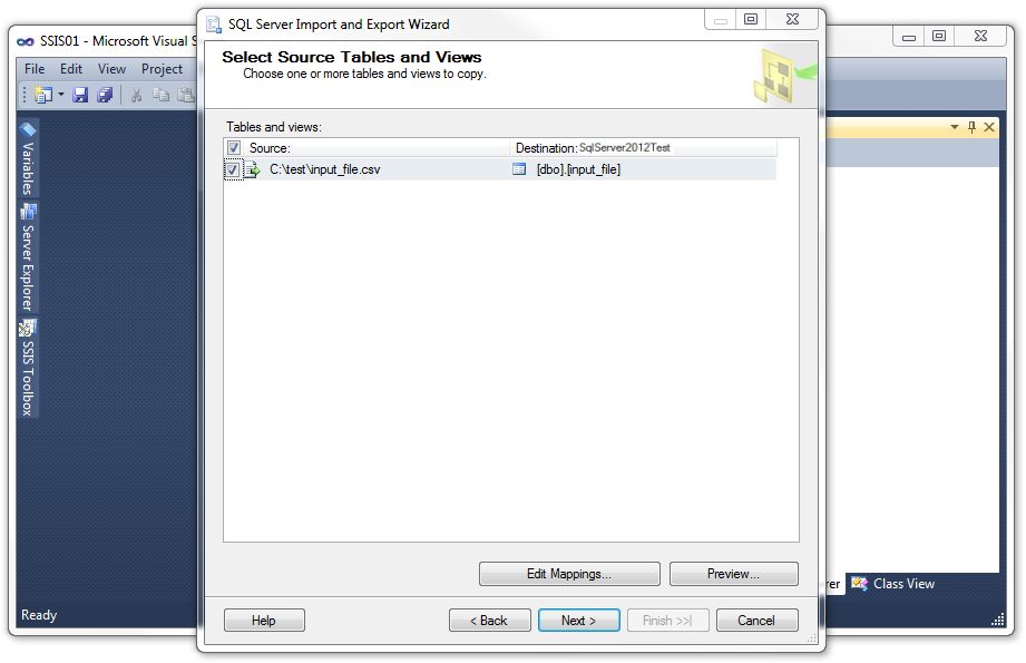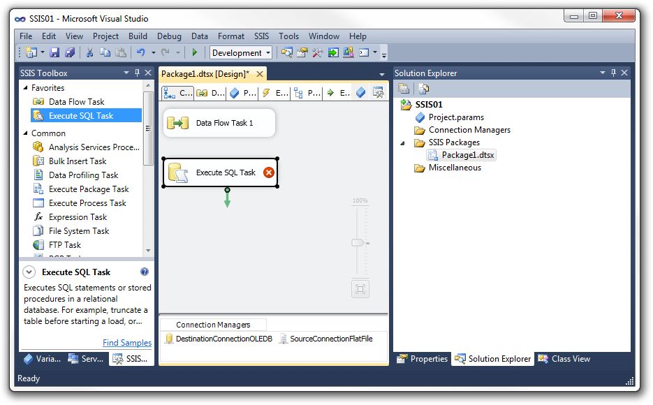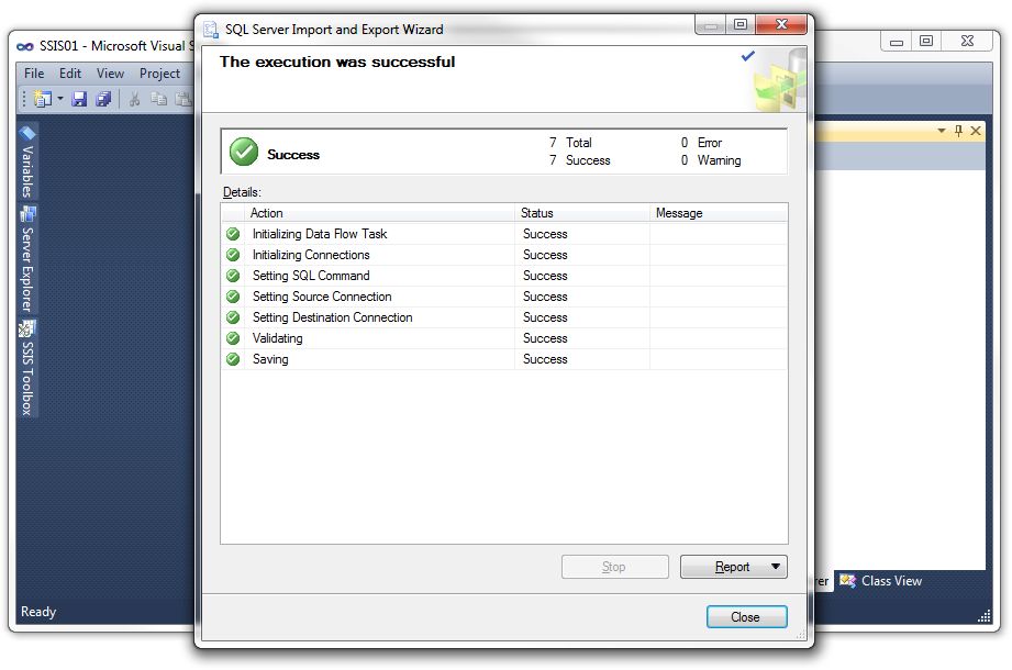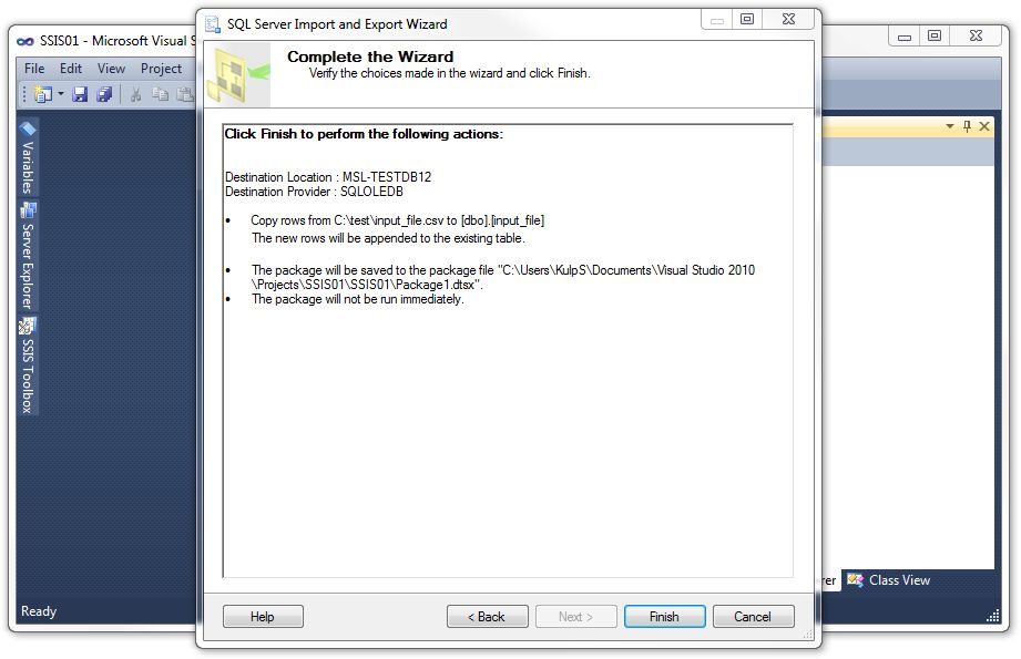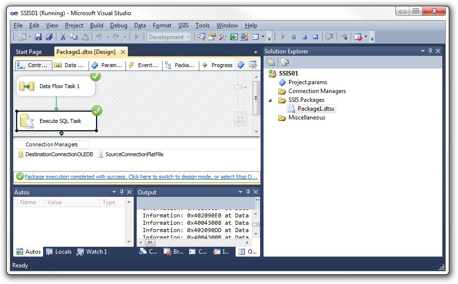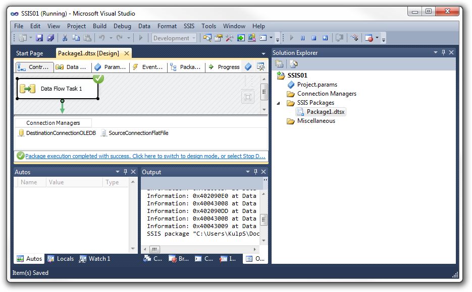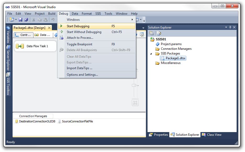 Run the new SSIS package by selecting Debug-Start Debugging from the main menu.