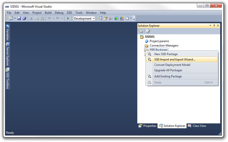Open a project in Business Intelligence Development Studio and start the SSIS Import and Export Wizard.