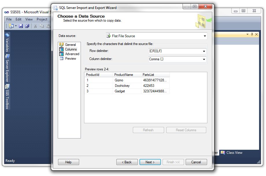 Select the Flat File Source data source and browse to input_file.csv, then click the Next button.