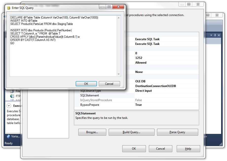 BEGIN TRY DROP TABLE dbo.Products END TRY BEGIN CATCH END CATCH GO CREATE TABLE [dbo].[Products]( ProductId [int] NOT NULL, [PartNumber] [int] NOT NULL ) GO DECLARE @Table Table (ColumnA VarChar(100), ColumnB VarChar(1000)) INSERT INTO @Table SELECT ProductId,PartsList FROM dbo.StagingTable INSERT INTO dbo.Products (ProductId,PartNumber) SELECT T.ColumnA, a.* FROM @Table T CROSS APPLY [dbo].[ParseIndividualValue](t.ColumnB,'|') a ORDER BY CAST(T.ColumnA AS INT) GO SELECT * FROM dbo.Products ORDER BY ProductId,PartNumber