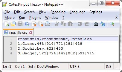 ProductId,ProductName,PartsList 1,Gizmo,463|914|771|281|418 2,Doohickey,422|453 3,Gadget,323|724|449|882|591|715