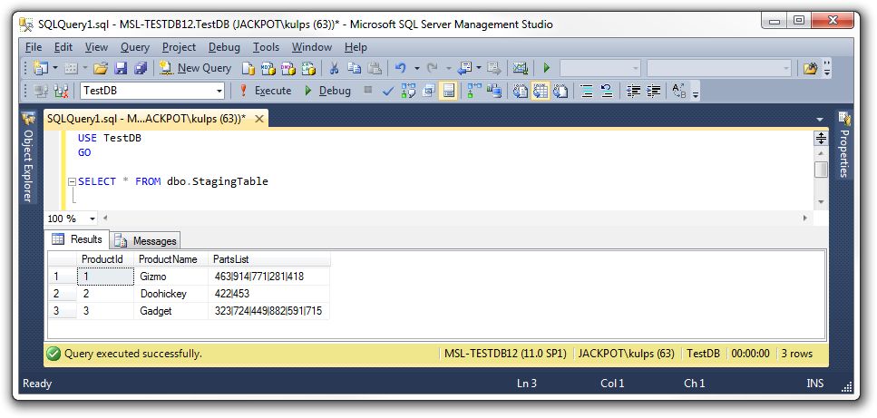 USE TestDB GO BEGIN TRY DROP TABLE dbo.StagingTable END TRY BEGIN CATCH END CATCH GO CREATE TABLE [dbo].[StagingTable]( [ProductId] [varchar](50) NOT NULL, [ProductName] [varchar](50) NOT NULL, [PartsList] [varchar](1000) NOT NULL ) GO INSERT INTO dbo.StagingTable (ProductId,ProductName,PartsList) VALUES (1,'Gizmo','463|914|771|281|418'), (2,'Doohickey','422|453'), (3,'Gadget','323|724|449|882|591|715') SELECT * FROM dbo.StagingTable