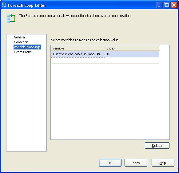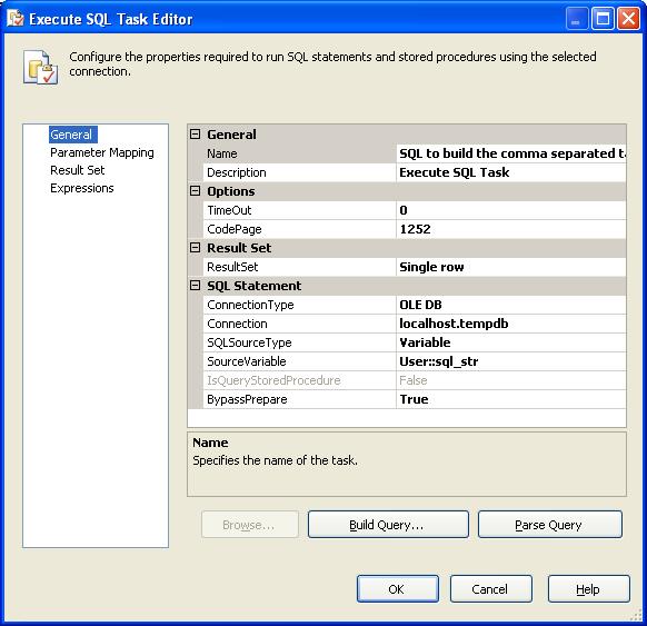 We will be using SQL to build our comma separated list of tables as they are iterated through the loop. An 'Execute SQL Task' will use a dynamic SQL stored in a string expression variable called sql_str. The expression basically appends the current table name to the list of existing table names and will have the following value: