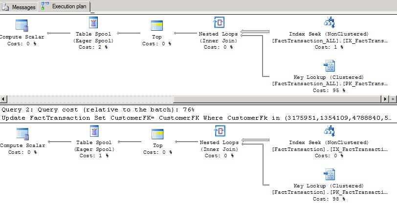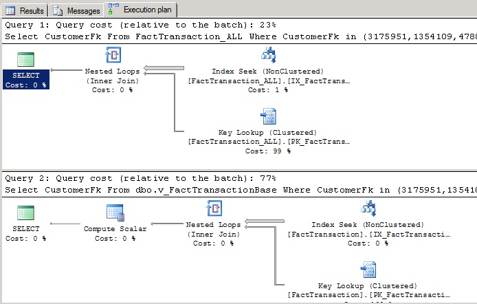 For this scenario, I have selected 2 customer FKs who have transactions (intentionally) in all partiton tables, i.e. FactTransaction. Note that this time I have not specified a transaction date and therefore all the tables will need to be scanned to retrieve the data.