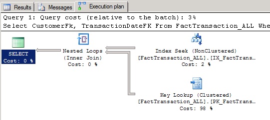 Taking a look at the below execution plan, it becomes more obvious why less data pages were read to satisfy the same query. In the first SELECT, the whole table/index was read and then a key lookup was performed to get the TransactionDateFK column.