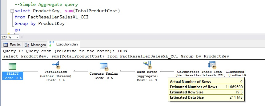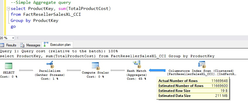 The picture below shows an aggregate query and its execution plan. Note that all 11 million rows flow from SCAN node to the AGGREGATE node. The SQL Server Execution Times: CPU Time = 547 ms and time elapsed = 389 ms.