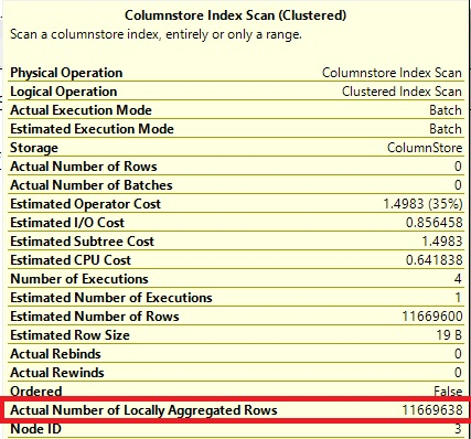 Other interesting thing to notice is that the SCAN node has a property to show the number of rows that were aggregated locally. As expected for the example above, as shown in the picture below, all the rows were aggregated locally.