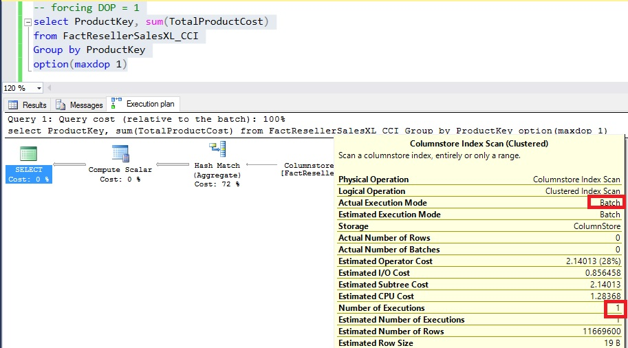 Take a look at the below query. The two HASH MATCH operators and SCAN on the Columnstore index are run automatically in batch mode. One of the HASH MATCH operator’s execution details are shown in below image.