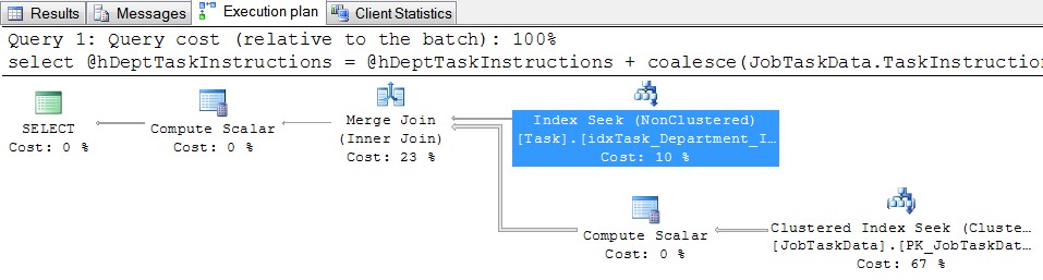 select @hDeptTaskInstructionsThis may or may not be the most efficient way of combining row data into a single string, but it does get the job done while eliminating the cursor. This query produces the same results as the original query but with even less load on the server. The execution plan is a single iteration of the select and uses my indexes as expected.