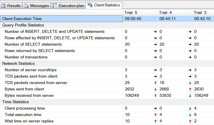 It’s pretty obvious that the LOCAL and FAST_FORWARD options on cursors provide a less resource intensive execution. But you can also see the difference in the client statistics when the queries are executed. Trial 4 has the Local and Fast_Forward options set on the cursor, while trials 3 and 5 had those keywords removed. The Local and Fast_Forward options cut the number of I/O packets and the total bytes sent from the server in half!