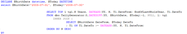 The age calculation is compete with total success. The only thing could be tweaked is the fixed number of records in "years" loop. 1000 may be a waste of resources for "normal" age calculations, and if you turn this script into an inline table function and use for massive age calculations it may impose some performance issues. On another hand, you never know what you can expect from members of McLeod clan - who knows what kind of birth certificates they can present?