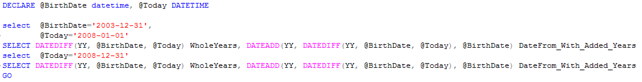 Years Months EndOfLastWholeYear DateTo -------------------- -------------------- -------------------------- ----------------------- 4 11 2008-06-30 00:00:00.000 2008-07-30 00:00:00.000