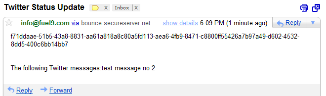 -- Declare Key'sdeclare@gKey uniqueidentifier;set@gKey = newid()declare@jKeyTwitt uniqueidentifier;set@jKeyTwitt = newid()declare@jKeyEmail uniqueidentifier;set@jKeyEmail = newid()declare@StatusUpd nvarchar(50);set@StatusUpd='test message no 2'--- Create new EventinsertEVENT_MASTER (gKey)values(@gKey)-- Twitter Status UpdateinsertOUT_TWIT(gKey, jKey, Status)values(@gKey, @jKeyTwitt, @StatusUpd)-- Send notification email outinsertOUT_EMAIL(gKey, jKey, Subject, Body)values(@gKey, @jKeyEmail, 'Twitter Status Update', 'The following Twitter messages:' + @StatusUpd)insertOUT_EMAIL_RECEPIENT(jKey, Email)values(@jKeyEmail, 'info@fuel9.com')-- Release Event for processingupdateEVENT_MASTERsetStatus=0wheregKey=@gKey